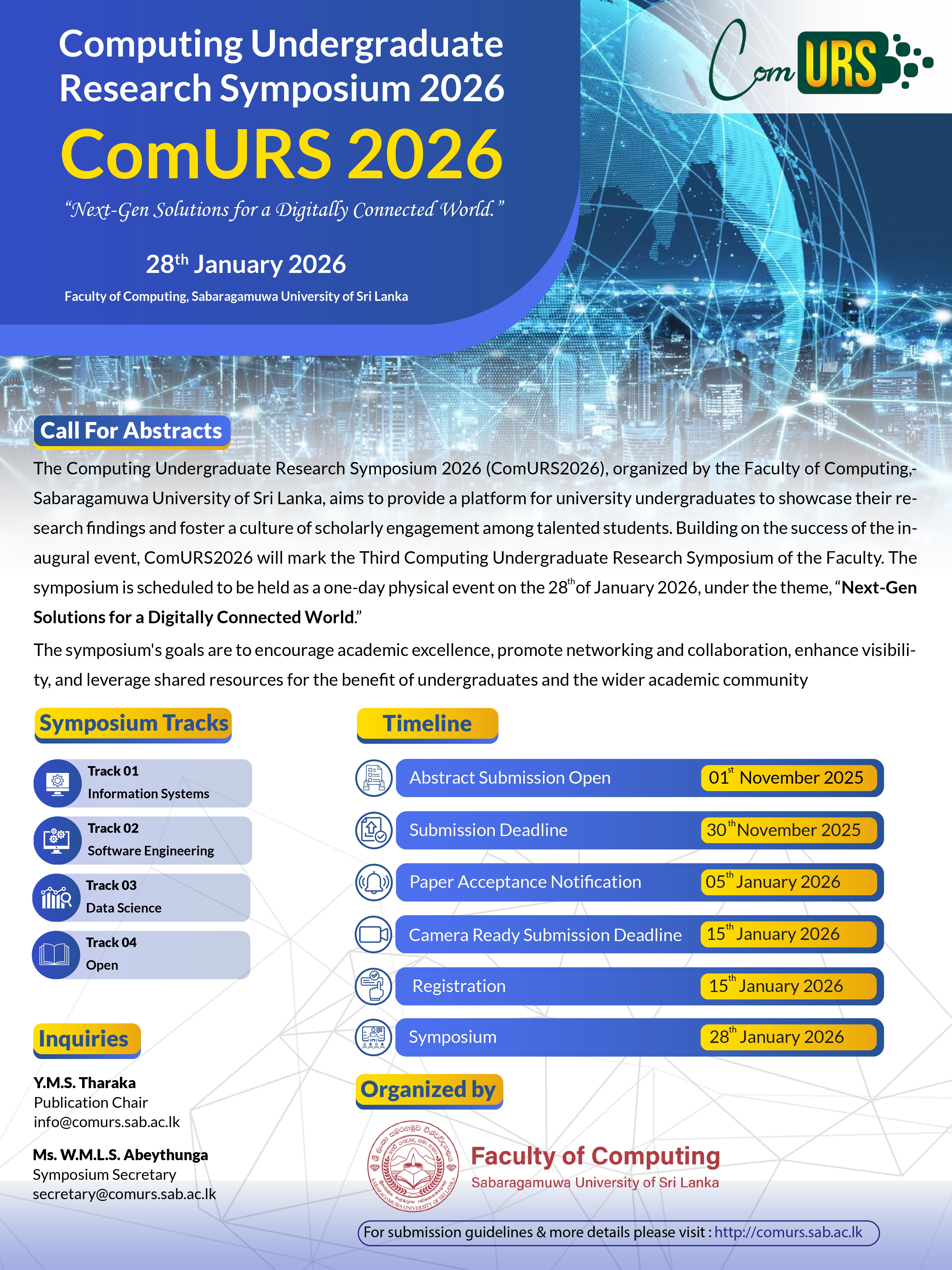 The Faculty of Computing, Sabaragamuwa University of Sri Lanka, is pleased to announce that abstract submissions for the Computing Undergraduate Research Symposium 2026 (ComURS2026) are now officially open.