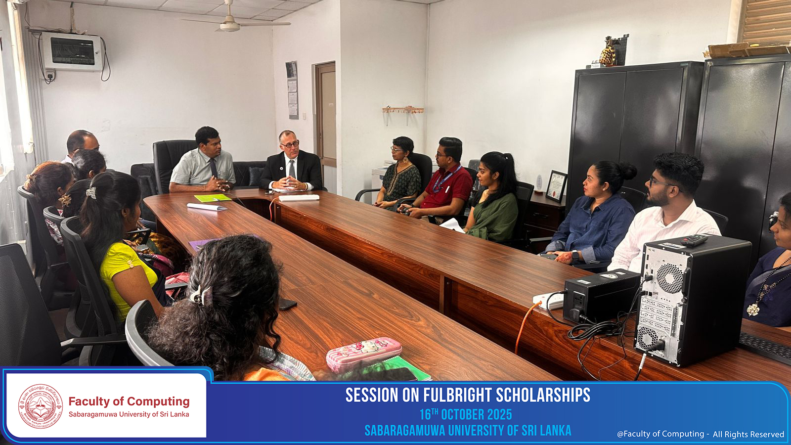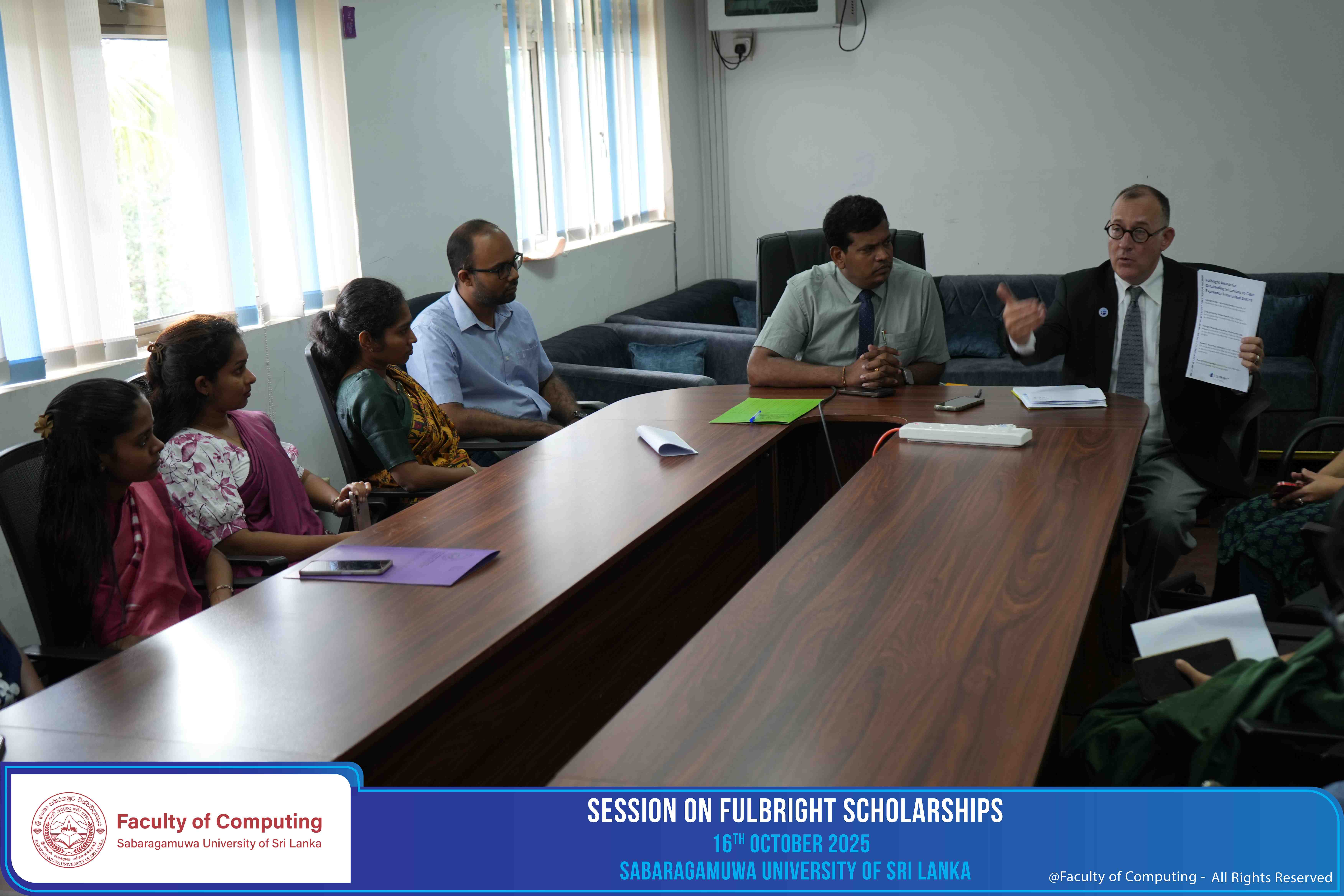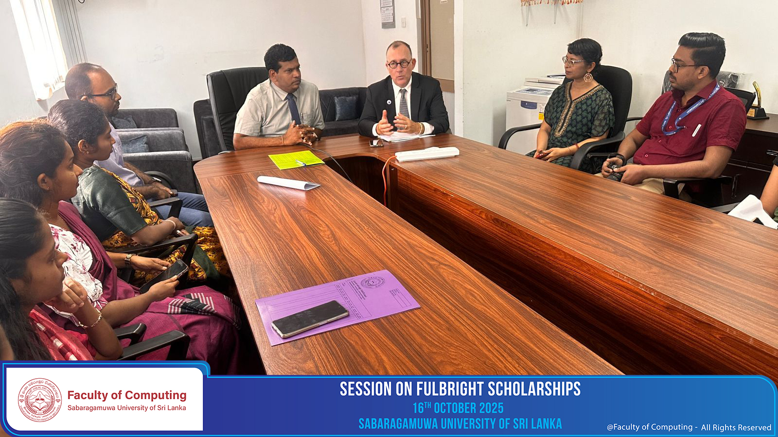 The Faculty of Computing, Sabaragamuwa University of Sri Lanka, had the privilege of welcoming officials from the United States–Sri Lanka Fulbright Commission for an insightful discussion on Fulbright Scholarships with its academic members. The visit took place on 16th October 2025 at the Dean’s Office Boardroom and was graced by the presence of Prof. S. Vasanthapriyan, Dean of the Faculty, Dr. Patrick McNamara, Executive Director of the United States–Sri Lanka Fulbright Commission, and Dr. Usree Bhattacharya, U.S. Department of State English Language Specialist, along with the academic staff of the Faculty of Computing.