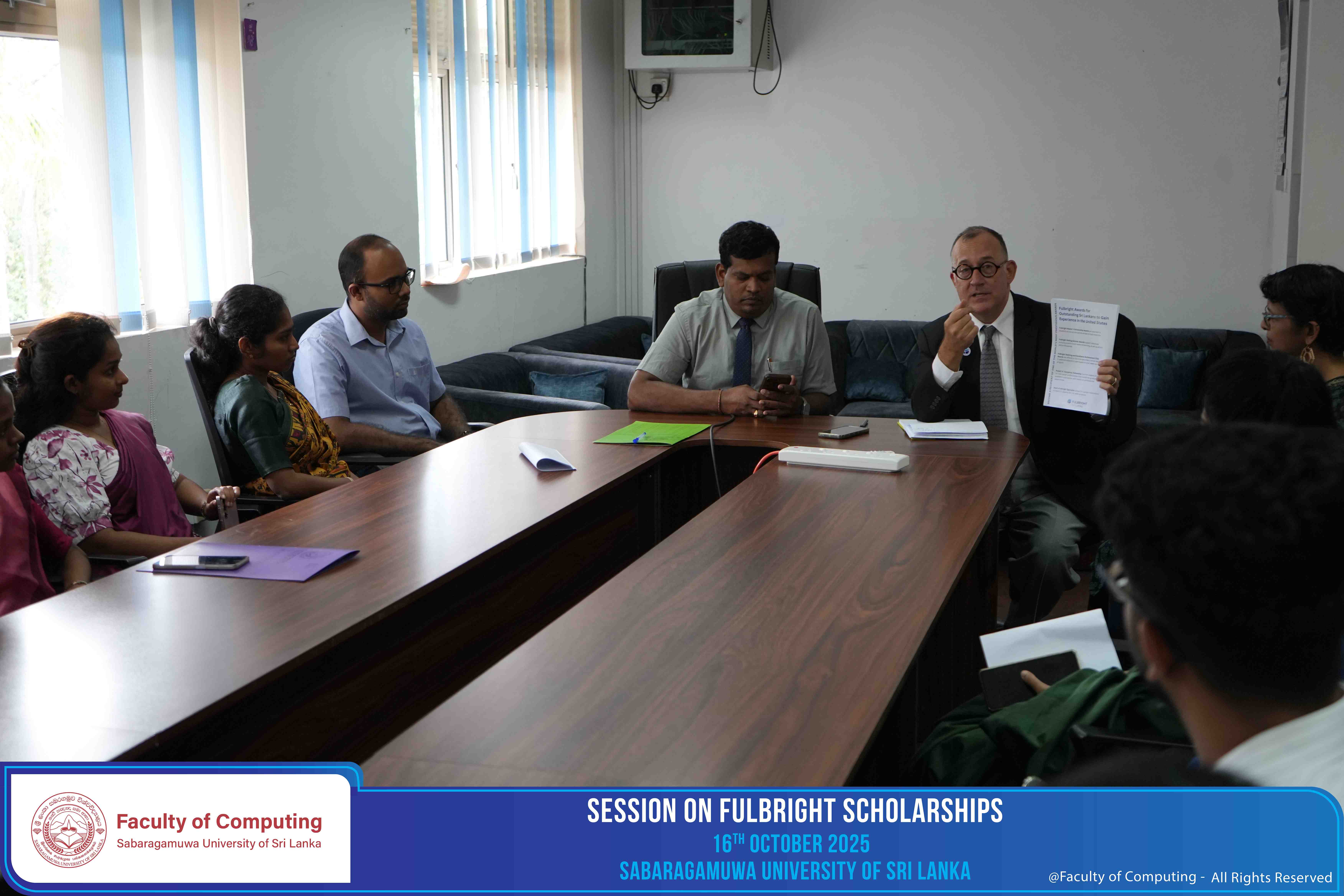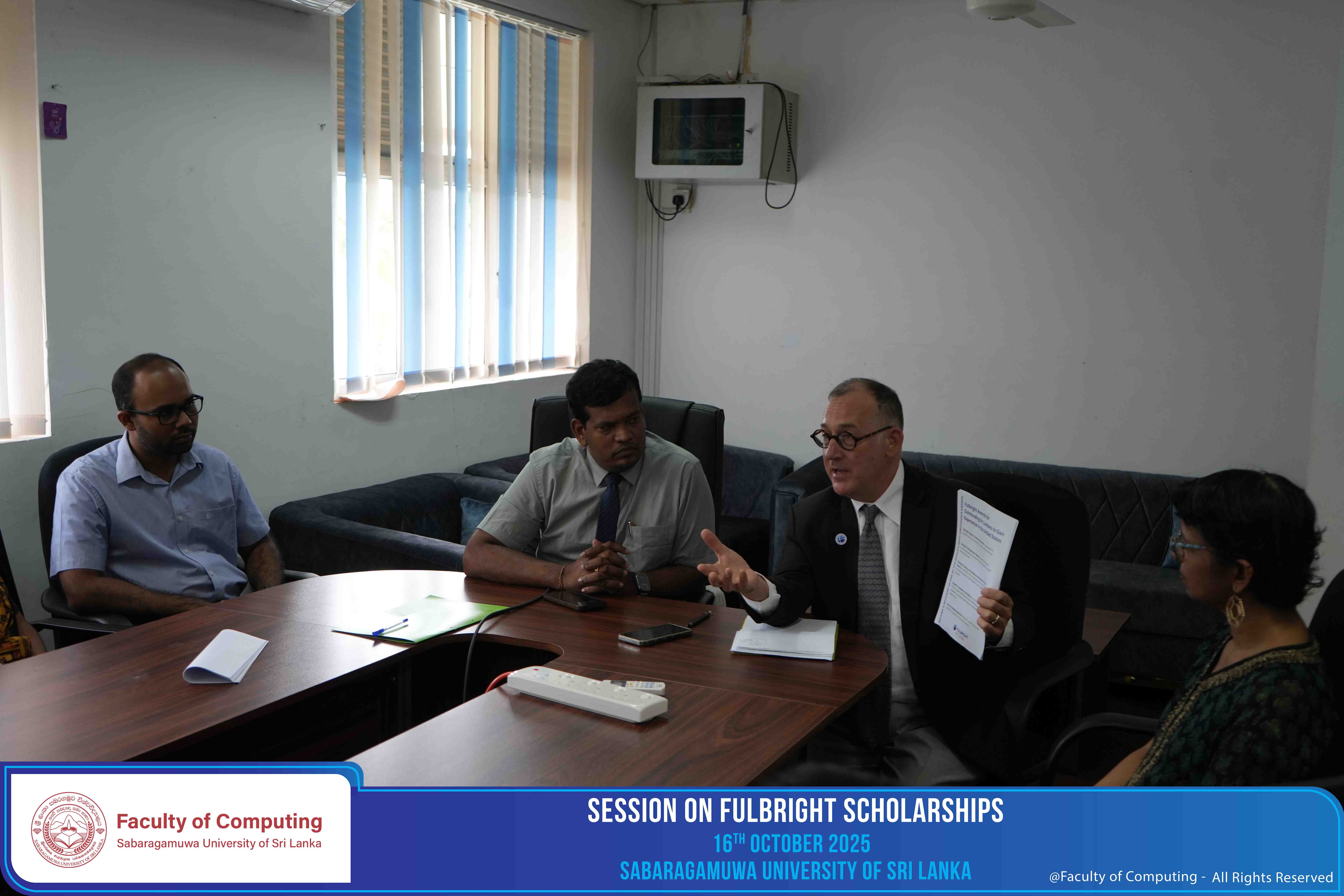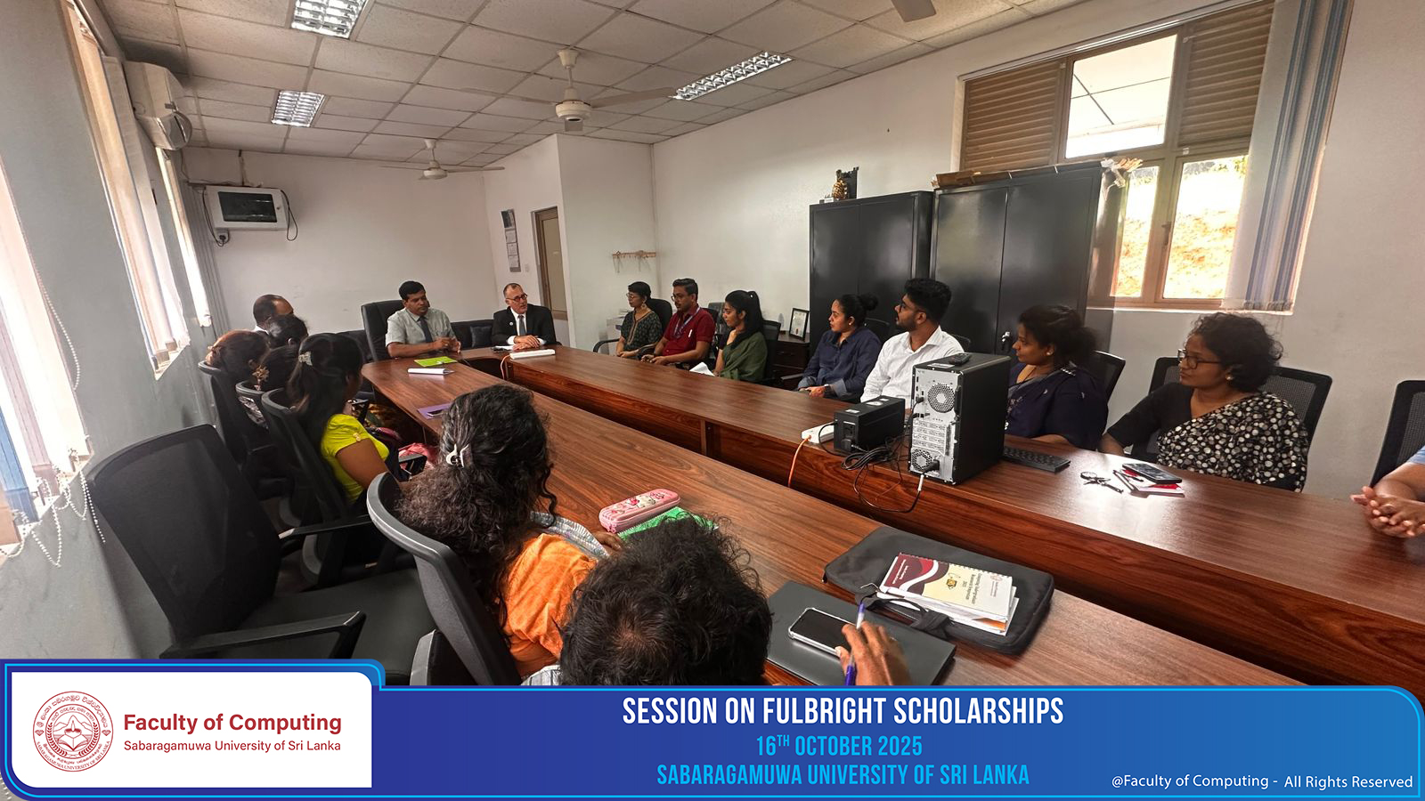 The Faculty of Computing, Sabaragamuwa University of Sri Lanka, had the privilege of welcoming officials from the United States–Sri Lanka Fulbright Commission for an insightful discussion on Fulbright Scholarships with its academic members. The visit took place on 16th October 2025 at the Dean’s Office Boardroom and was graced by the presence of Prof. S. Vasanthapriyan, Dean of the Faculty, Dr. Patrick McNamara, Executive Director of the United States–Sri Lanka Fulbright Commission, and Dr. Usree Bhattacharya, U.S. Department of State English Language Specialist, along with the academic staff of the Faculty of Computing.