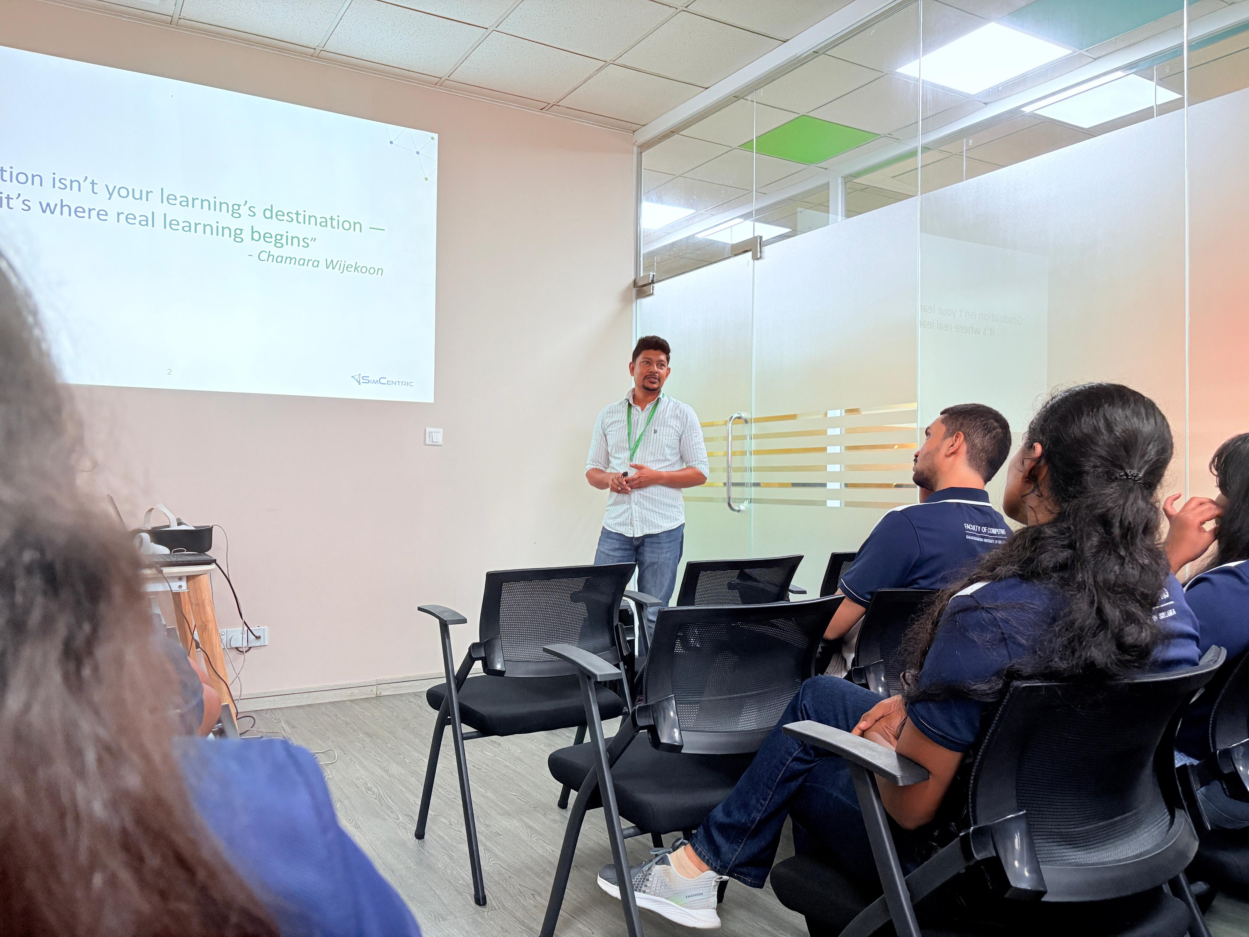 In the afternoon, students participated in a University–Industry Engagement visit to SimCentric Technologies, located at the Orion City, Colombo 09. This visit provided an invaluable opportunity for students to witness real-world software development processes and engage with professionals working on cutting-edge technology solutions.