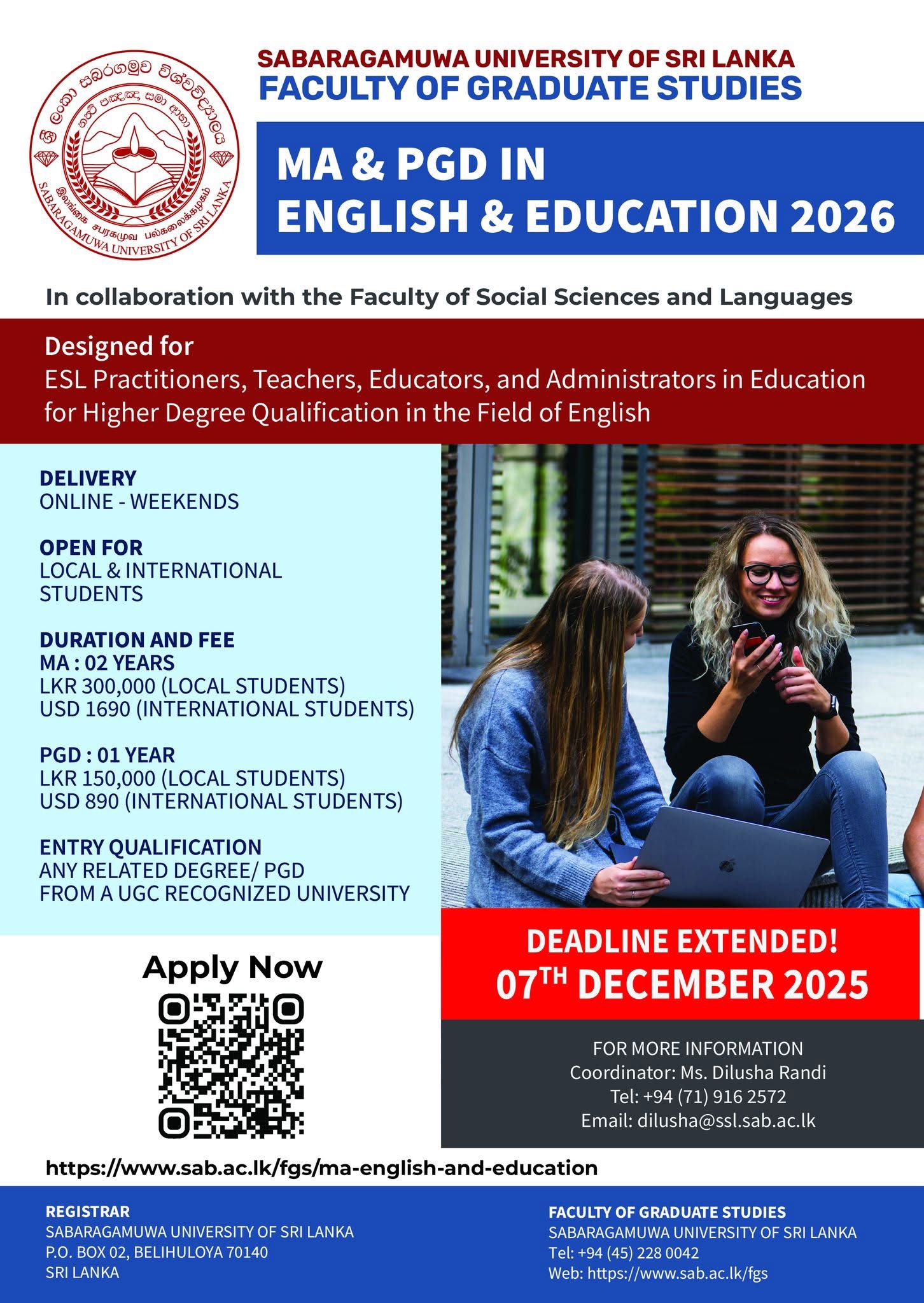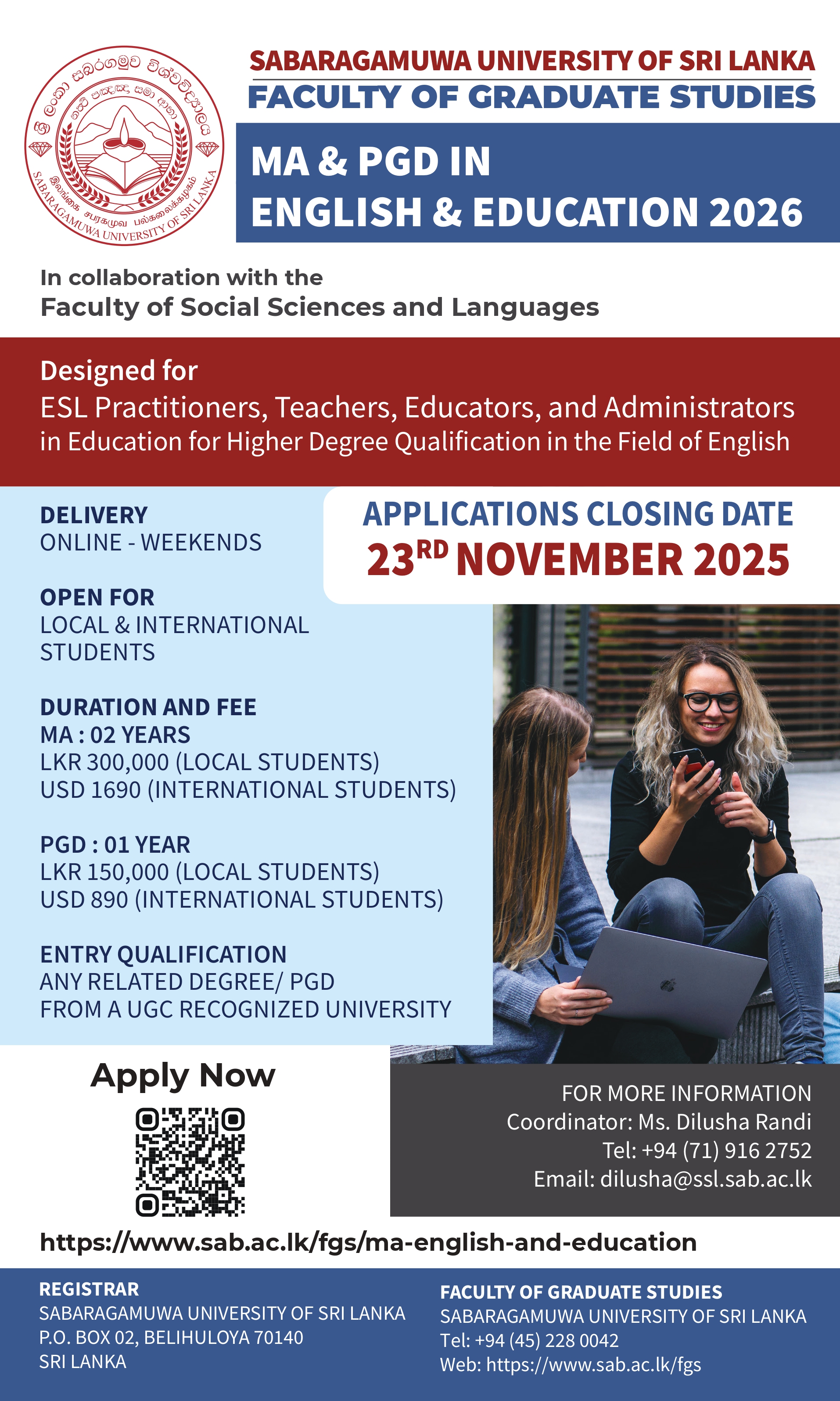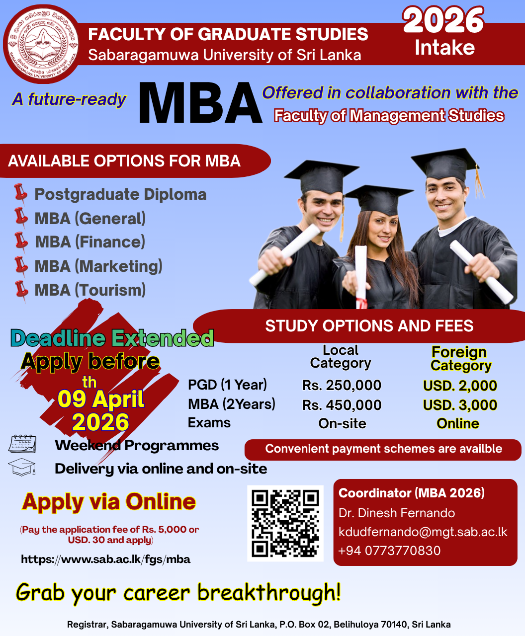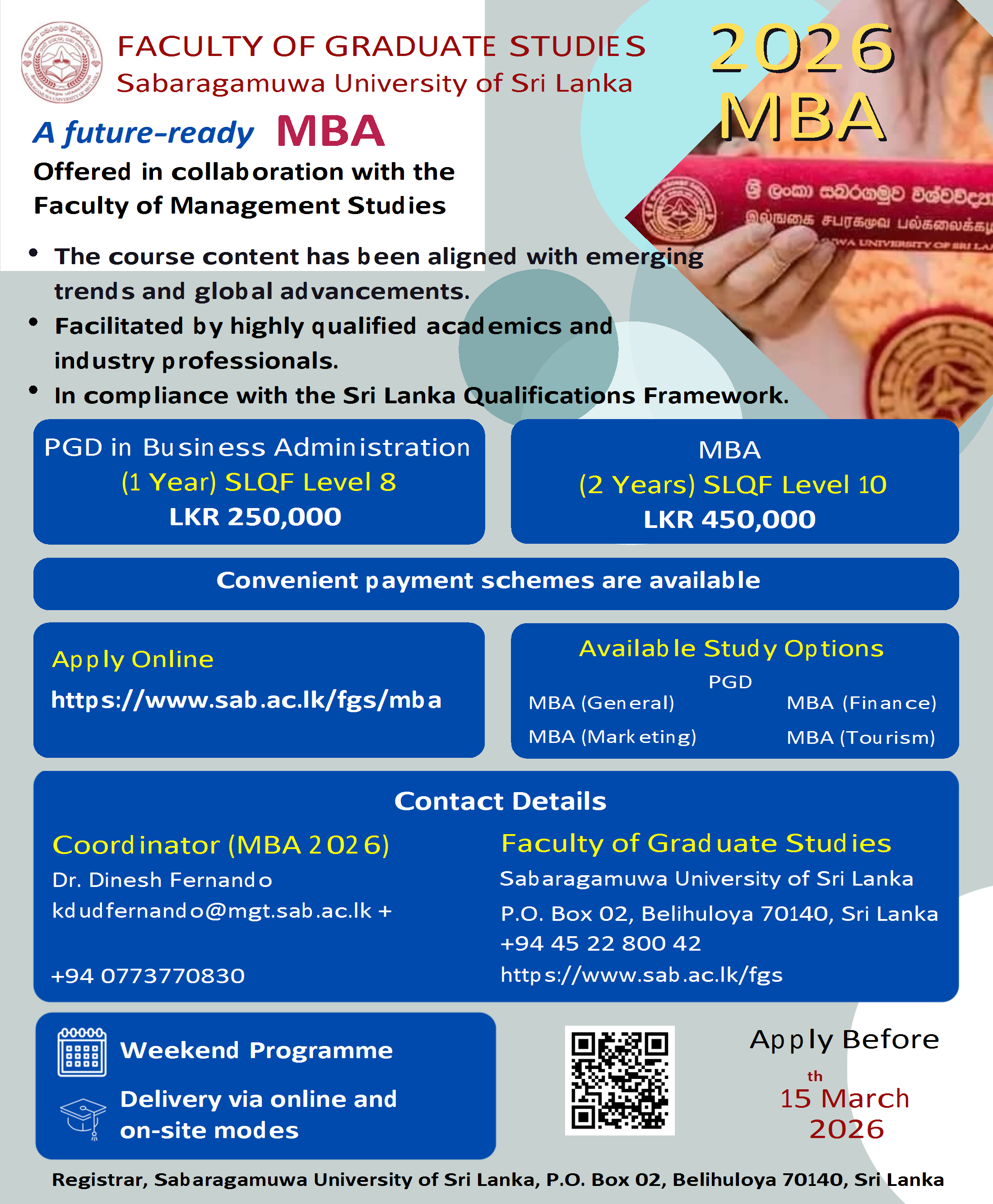 Thank you for your interest in the academic programmes offered by the Faculty of Graduate Studies, Sabaragamuwa University of Sri Lanka. It is with pleasure that we look forward to serving you by realising the aspirations of your career progression and thirst for knowledge.