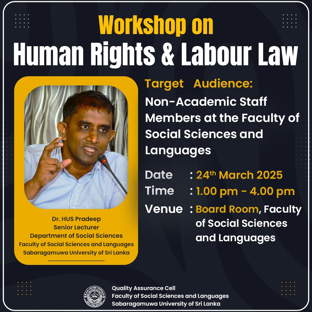 The Quality Assurance Cell of the Faculty of Social Sciences and Languages has successfully conducted a workshop titled "Human Rights and Labour Law" on 24th March 2025 at 1.00 PM in the Faculty Board Room, FSSL.