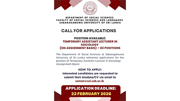 The department of social Sciences at Sabaragamuwa University of sri Lanka welcome applicartions for the position of Temporary Assistant Lecturer in socialogy(Assignment Basis)