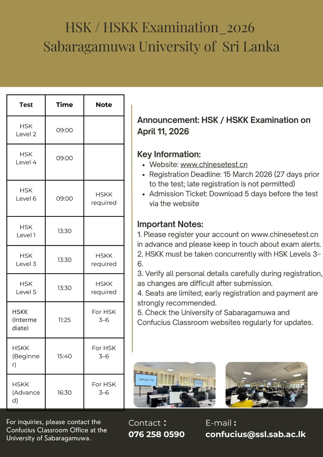 For more information, please contact Chinese Test Center of CCSUSL: Tel: +94-45-2285309 (Monday to Friday )