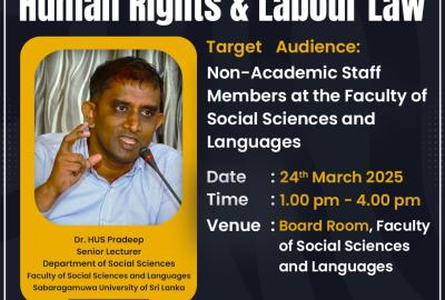 The Quality Assurance Cell of the Faculty of Social Sciences and Languages has successfully conducted a workshop titled "Human Rights and Labour Law" on 24th March 2025 at 1.00 PM in the Faculty Board Room, FSSL.