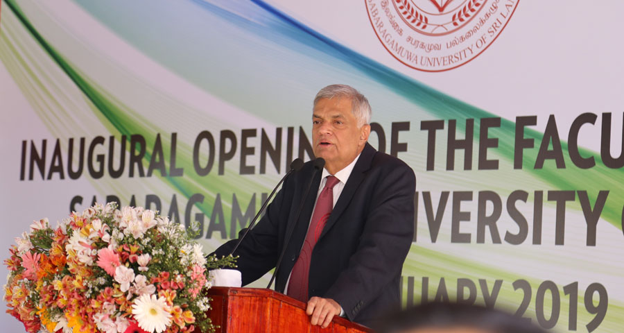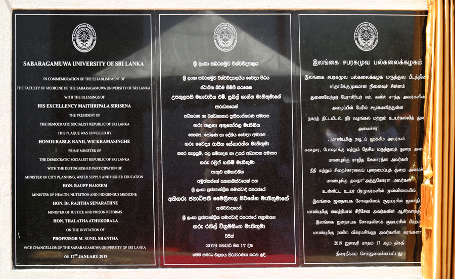 The Faculty of Medicine of the Sabaragamuva University of Sri Lanka (SUSL) ceremonially opened on 17th January 2019 as the tenth Medical Faculty in Sri Lanka’s university system by the Prime Minister of Democratic Socialist Republic of Sri Lanka Hon. Ranil Wickramasinghe, who present at the ceremony as the Chief Guest, with the blessing of the Chancellor, of SUSL, Ven Prof. Kumburugamuwe Vajira Thero.
